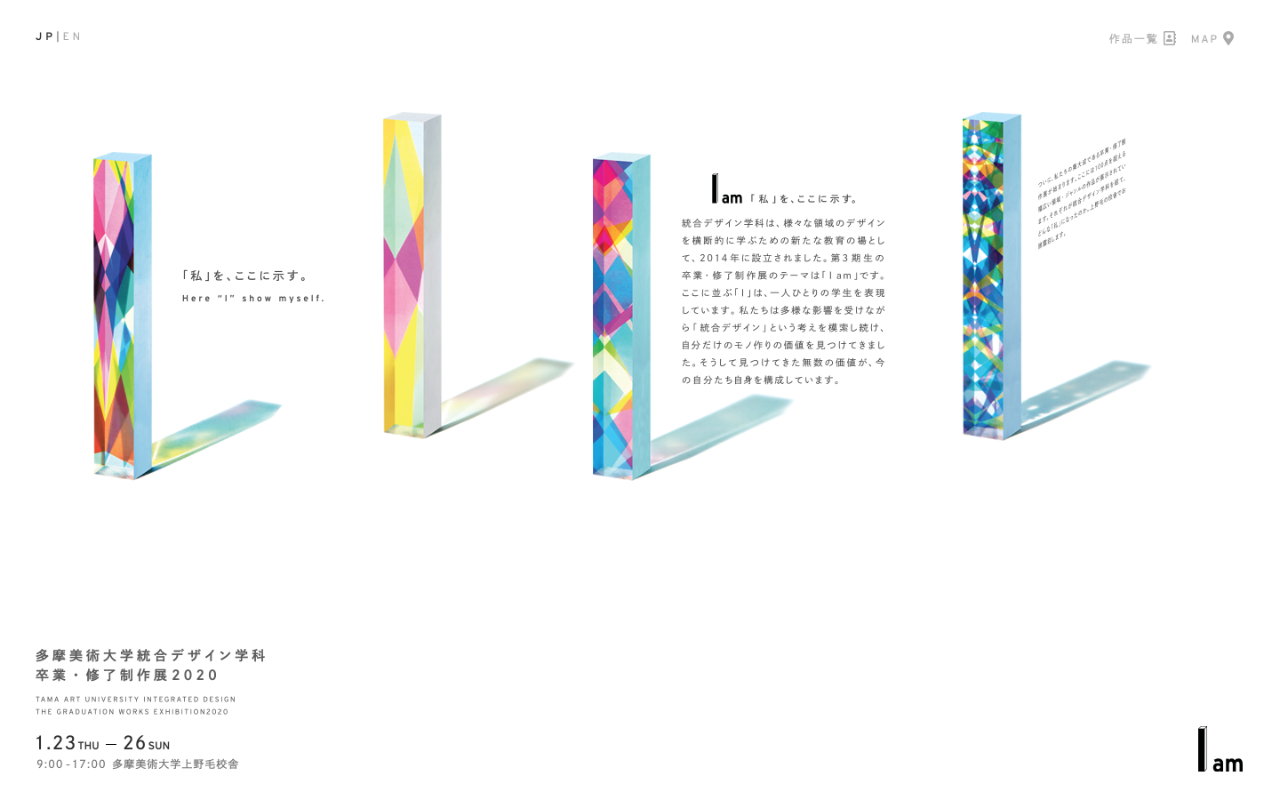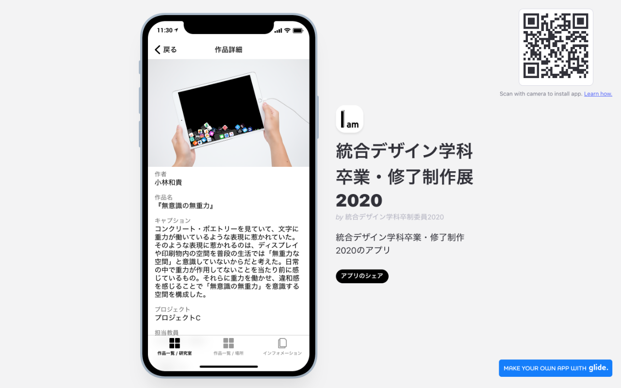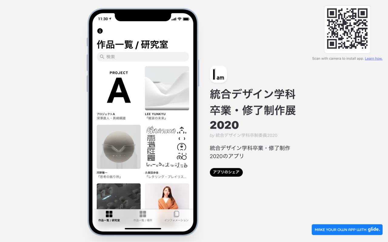 統合デザイン学科卒業・修了制作展2020のwebサイトとwebアプリを制作しました。webサイトは友人と2人で制作し、最初の段階ではリサーチをしながらデザインと技術的なことを一緒に制作しながら決めていきました。大枠の方向性が決まってから、コードを最適化・詰めていくことや導線アニメーションなどを担当しました。webアプリはglideというサービスを利用して制作しました。webサイトはwindowsでのマウス操作だと動作が安定しないことがあります。