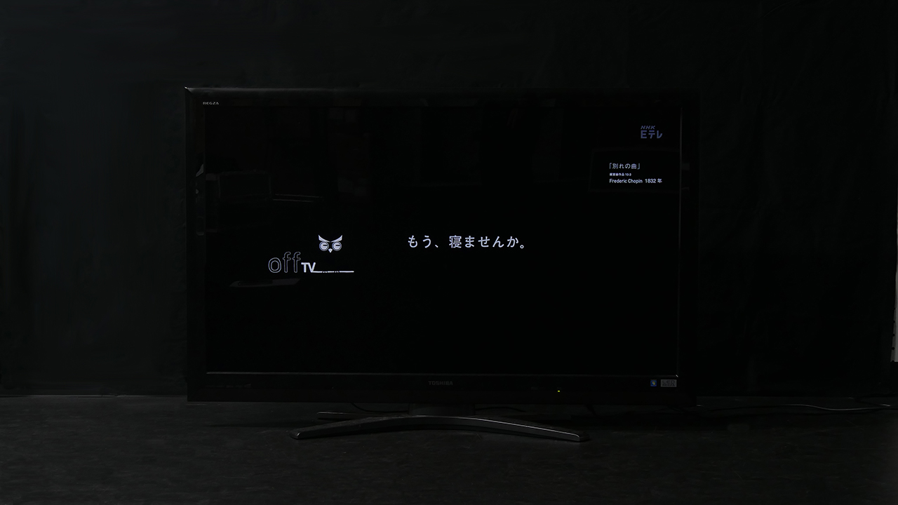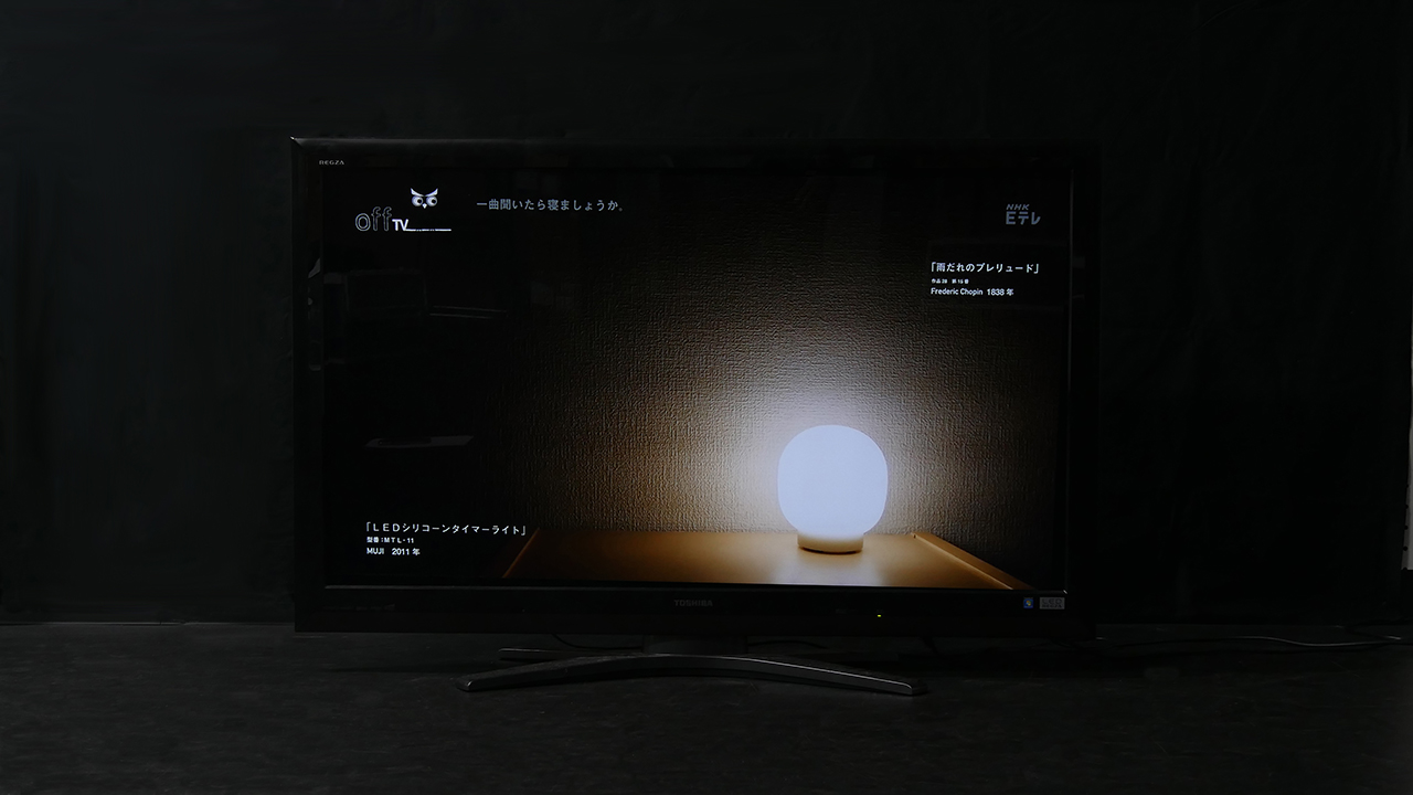 毎晩、ライトを紹介しながら睡眠に適したクラシックを流す番組です。 ライトを紹介するのはリモコンでテレビを消すという行為がライトを消すという行為に感じられ、消すことに面白みがうまれると思ったからです。 夜更かしをしてしまう人が番組を見たときに、テレビを消し寝てもらえるよう企画・制作しました。