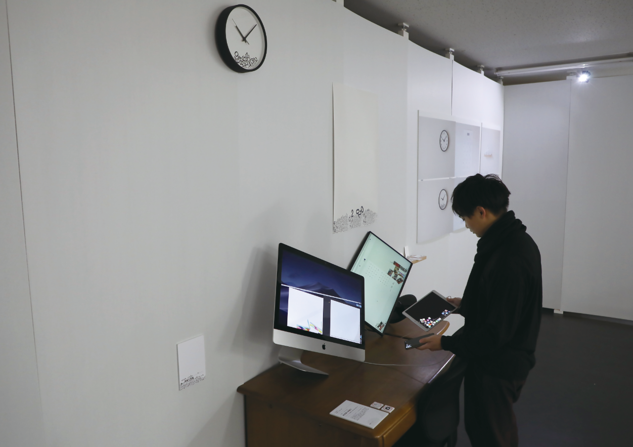 コンクリート・ポエトリーを見ていて、文字に重力が働いているような表現に惹かれていた。そのような表現に惹かれるのは、ディスプレイや印刷物内の空間を普段の生活では、「無重力な空間」と意識していないからだと考えた。日常の中で重力が作用していないことを当たり前に感じているもの。それらに重力を働かせ、違和感を感じることで「無意識の無重力」を意識する空間を構成した。